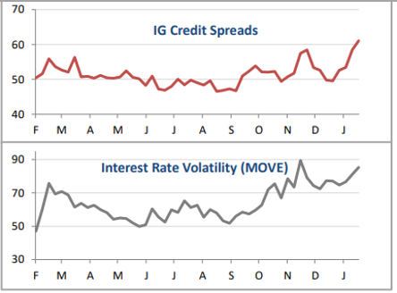 Credit Spreads and bond market volatility remains stubbornly high. High yield bond spreads as measured by CDX (5yr tenor) have increased by about 60bps to start 2022.