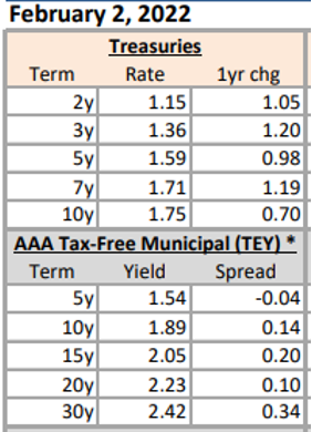 * Investor Activity: Tax-exempt interest rates finally followed US Treasuries to higher yields, and holders of tax-exempt municipals had one of their worst months on record. However, awash with cash, banks can now find value in municipals as the Muni to Treasury ratio shifted back to historical norms. The 10-year AAA Muni/UST ratio began the year at 63.8% and finished last week at 87%.