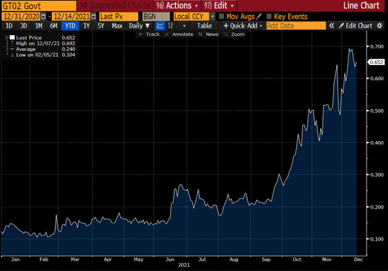 As we approach the end of 2021, it looks as if we will see the first time ever that the 2-year Treasury shows an annual loss (yes, even in nominal terms). Historically, the bond’s income has been enough to reinvest back into higher yielding securities as rates rise but given that 2-year Treasuries started 2021 at 0.12%, re-investable income has been sparse.