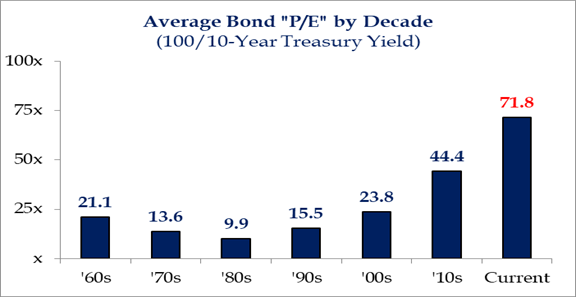 Looking ahead and thinking about future return potential, we think the current valuation of bonds is nothing short of scary, and that’s before considering inflation. Right now, the P/E ratio for a 10yr Treasury is 71.8x its current, forward, and forever earnings. 71.8X. 71.8 times earnings that cannot grow, cannot defend against inflation, and cannot give you enough re-investable income to offset the loss of purchasing power.