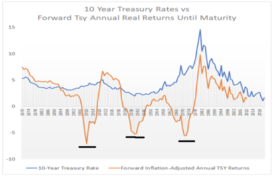 Looking back at history, we can see the inflation-adjusted effect on bonds returns during periods of low yields and high inflation. 3x in the last ~100 years, bond holders were stuck holding the bag of compounding capital at negative real returns. These periods equate to a loss of purchasing power…