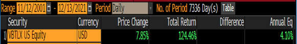When looking at a stock, bond, real estate, or just general asset allocation, over long periods of time, investors can expect to earn: the yield on the investment (interest income or dividends) + the underlying growth of the asset. As a bond example, we’ve included this Yield + Growth metrics of the Vanguard Total Bond Market Index since 11/2001: