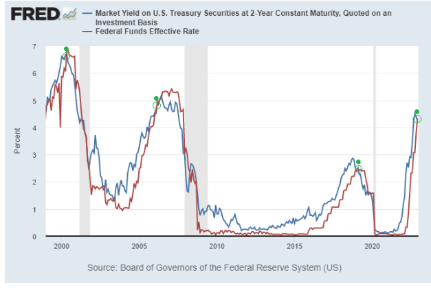 John Luke: so the market-driven 2 Year Treasury rate has historically been better at letting investors know where we might be in the rate cycle