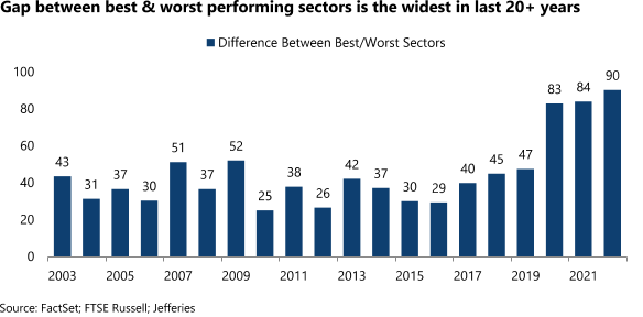 Dave: but within the indices, major dispersion in performance across sectors in recent years