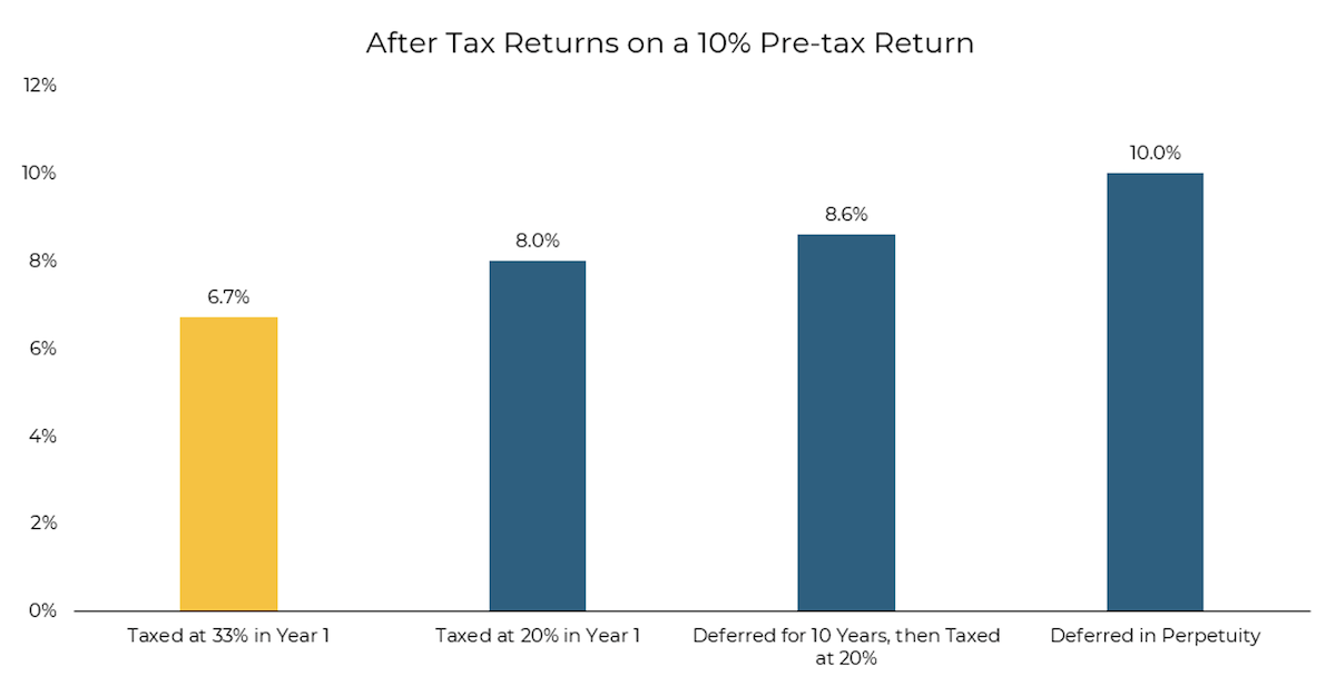 Most discussions about tax efficiency focus on maximizing after tax returns, and for good reason. The math is compelling. Consider a 10% pretax return: at a 33% short term tax rate, it becomes 6.7% after taxes if taxed annually. If held for just over a year and taxed at the 20% long term rate, that same return becomes 8.0%. Defer taxes for a decade, and the 20% rate applied at the end turns the 10% pretax return into an 8.6% annualized post tax return, thanks to tax deferred compounding. And if taxes are deferred indefinitely, a 10% pretax return remains a full 10% post tax.