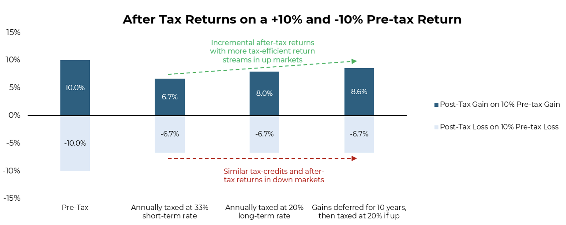 A simplified chart demonstrates how deferring gains while harvesting losses creates an asymmetric benefit: it increases the return on the upside by the tax savings, while on the downside it captures the full tax credit of a loss, even the ability to offset short-term gains that would otherwise be taxed at a higher tax rate).