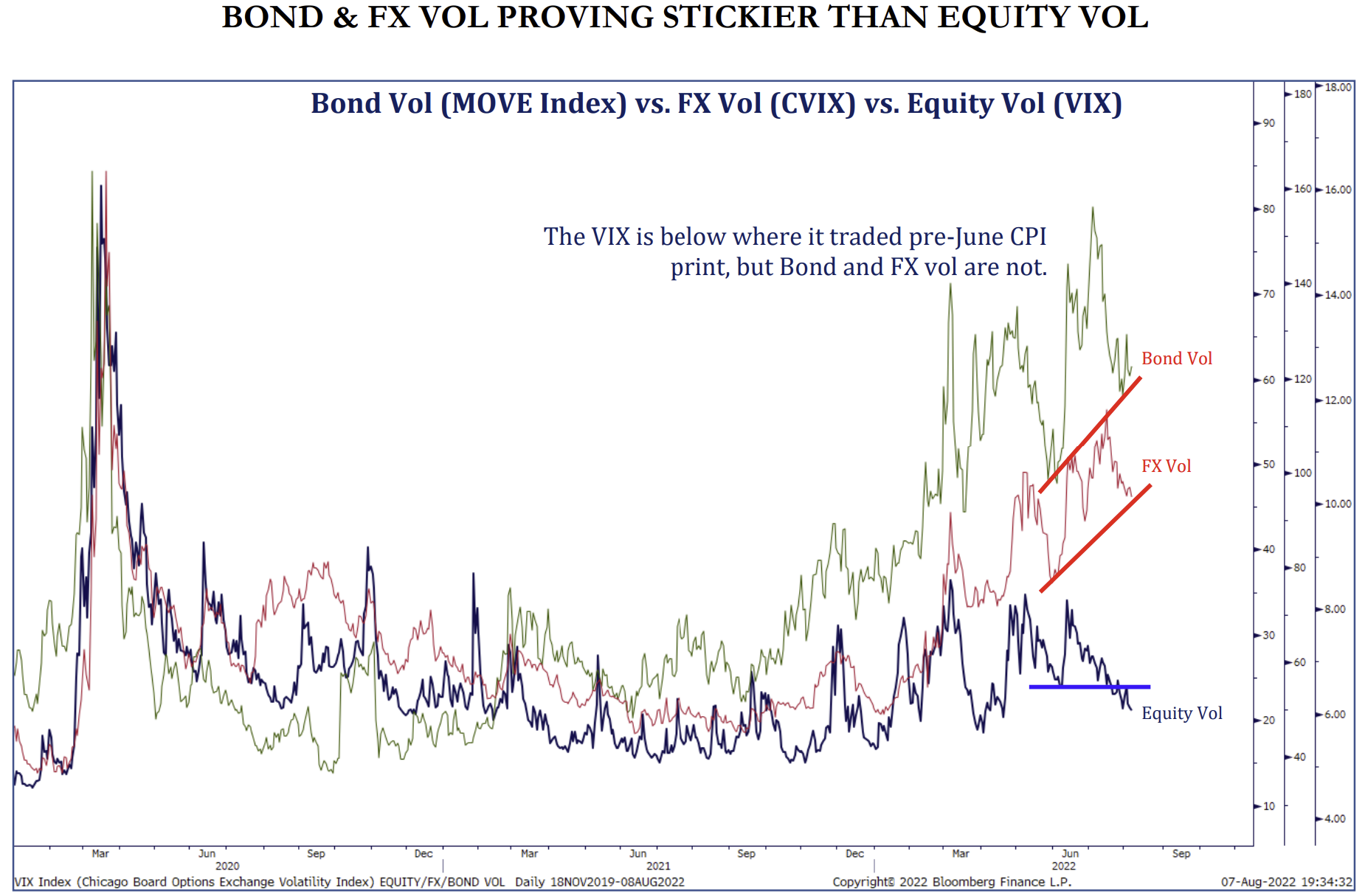 The MOVE Index (Merrill Lynch Option Volatility Estimate) measures the market’s expectation of implied volatility of the US bond market using 1-month Treasury options weighted for 2, 5, 10, and 30 year contracts.