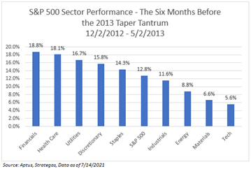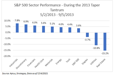 During the Taper Tantrum, the Industrial sector, followed by Consumer Discretionary, were the best performing sectors during the 2013 period. On the opposite side of the spectrum were the yield-oriented sectors of Real Estate, Communications, Utilities, & Consumer Staples.