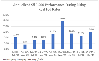 Though, if you look at longer-term periods, the market tends to continue to reward those willing to accept risk. Six months into the tightening, the market tends to recoup all losses. In fact, if you look over the entire tightening cycle, equity market performance during periods of a rising real Fed Funds rate shows that overall, it tends to pay to remain invested. The average return over the 9 periods below is 12.1%, which outpaces the overall compound annual return of the equity market since 1960 by about 150bps.