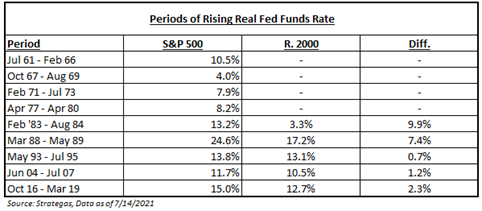 First, we would assume that traditional fixed income would be Heartless, given that real rates tend to rise on the announcement of a tapering. So, what areas of the stock market have outperformed during these tightening periods? Well, for one, and this surprises me, given my marriage to smaller stocks, it pays to be large.