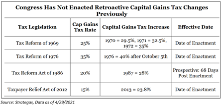 – Capital Gains Taxes – Investors have never seen capital gains taxes be retroactive. We would assume that this trend will continue. We also do not believe that the tax increase will be prospective to give investors.