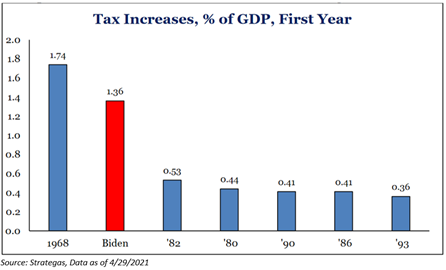 The Biden tax increases are close to $3 trillion of new taxes over the next 10 years. If Biden got everything he wanted, the tax increases would be roughly 1.3% of GDP and nearly 3x larger than the tax increases over the last 40 years from Obama, Clinton, Bush, and Reagan, which averaged around 0.4% of GDP. We have not raised taxes at this scale since the late 1960s when tax increases equated to 1.7% of GDP.