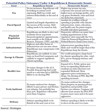 Yes, we do believe that yesterday’s Georgia Senate runoff could have substantial implications for the markets if both Democrat candidates win, which appears likely, given the high levels of complacency in markets right now. So, what does a Democratic Senate mean for markets?