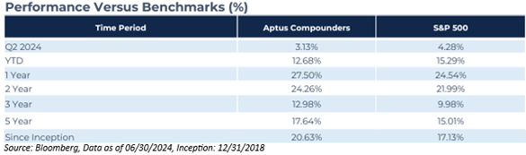 Aptus Compounders slightly trailed its S&P 500 benchmark during Q2, by 1.3%. After outperforming by +10.6% in 2023, the strategy has given up a bit of that outperformance with its second straight quarter of relative underperformance. A lot of the drivers of relative performance last year took a breath in the first half of 2024. The relative underperformance versus the S&P 500 (-2.61% year-to-date) has simply come from not owning NVIDIA (NVDA), which contributed 4.57% to the index’s absolute performance. Despite this, the strategy has still outperformed the index over the last twelve months, by 3.0%. The strategy continues to have exposure to the artificial intelligence (“AI”) renaissance through the ownership of Adobe Inc. (ADBE), Alphabet Inc. (GOOGL), Broadcom Inc. (AVGO), and Microsoft Corp. (MSFT).