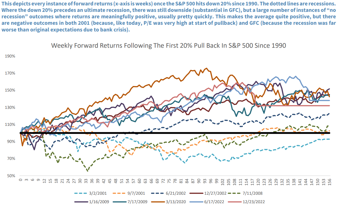 Joseph: Pundits and strategists seem split on recession vs. no recession, but in general, a 20% drop in the S&P 500 has indicated material economic weakness
