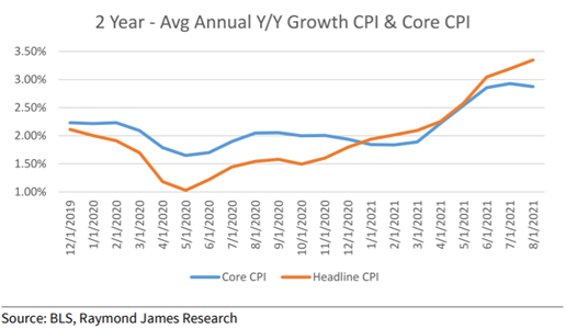 The chart below shows the 2-year average headline CPI and core CPI, which we believe is a better way to look at CPI given low comps in 2020. What it shows is both the core and headline CPI averaging ~3% over the last 2 years – we will see how this trends moving forward. Team “Transitory” believes inflation is peaking and will come down as transitory factors wane, while Team “Inflation” sees Owners Equivalent Rents (OER)/rent inflation continuing to drive CPI higher even with transitory factors decreasing.