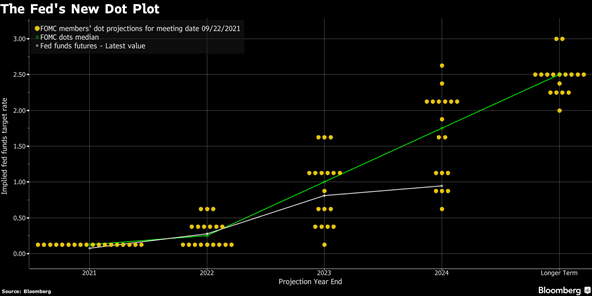 The FOMC meeting also provided a fresh dot plot with 2024 projections. While in today’s world 2024 seems eons away, the apparent takeaway was the very wide dispersion of views among the committee members of when and how fast to raise rates. The median 2022 dot moved up by half a notch which indicates that the FOMC is split evenly between those that want to raise rates next year and those that want to wait until 2023.