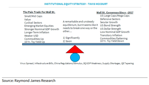 For a nice visual on the differing beliefs of Team Transitory vs Team Inflation, our friends over at Raymond James put together a fulcrum based upon the different interpretations of inflation expectations and general market positioning.