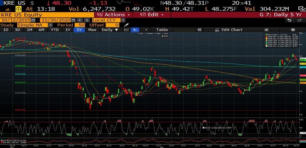 Clearly, banks aren’t without risks. If stimulus doesn’t materialize, that will be a headwind on Treasury yields and the yield curve, not to mention loan growth. Additionally, the Fed could alter QE to focus on buying longer-dated Treasuries, effectively putting a headwind on the rise in the 10-year yield and bank net interest margins (there’s been rumblings about this for a few weeks and we believe it could happen at the December meeting).