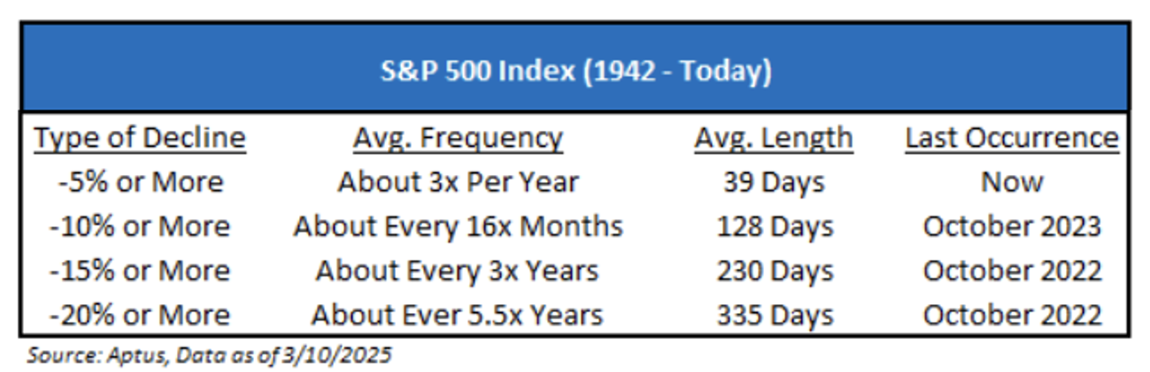 The S&P 500 has seen a larger decline in 2025 than experienced in 2024 (~8.6% through 3/10 vs -8.5% in 2024). However, the average annual decline since 1980 has been -14%.