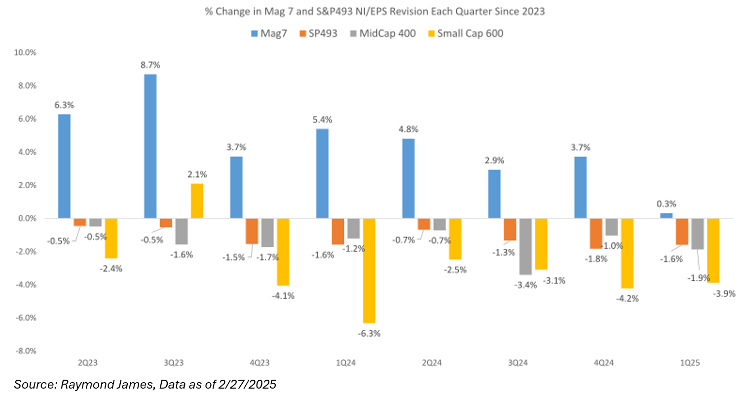 - First, earnings revisions for the Magnificent 7 have been coming down in 2025 after 7 straight quarters of unbelievably positive revisions,