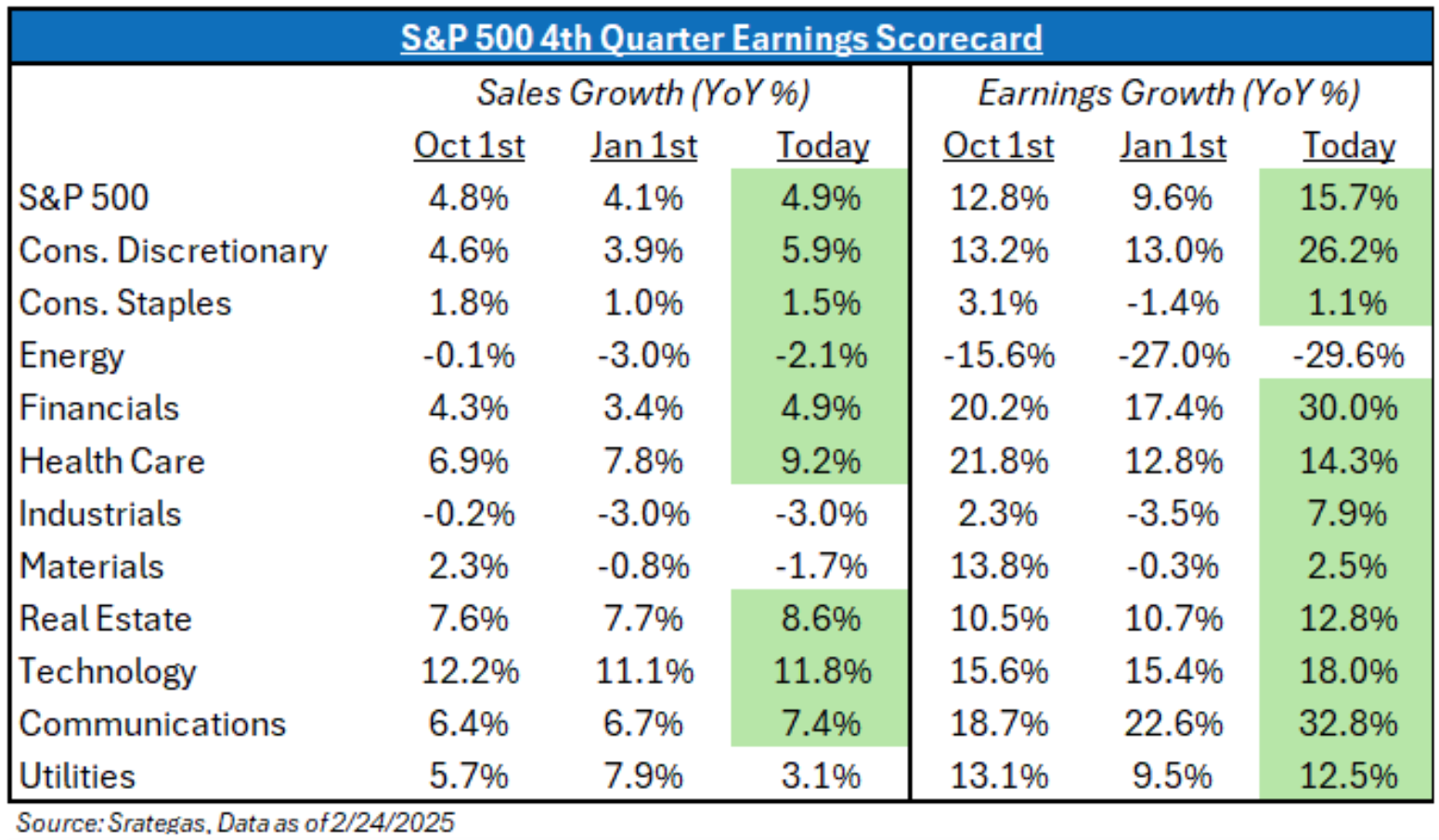 More specifically, S&P 500 companies demonstrated healthy corporate fundamentals during Q4 2024. Aggregate EPS grew 15.7% YoY, beating the consensus expectation of 8% growth at the beginning of the reporting season. The median stock grew earnings by a more modest 7%, which is better than previous periods.