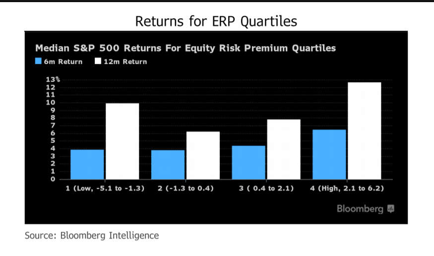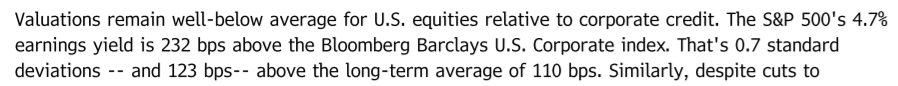 Here are two snips from Gina Martin Adams at Bloomberg illustrating this point. She refers to the equity risk premium. This is simply the earnings yield (think Price to Earnings discussed above flipped upside down) of the stock market relative to the yield on bonds. She compares the earnings yield to Treasury and corporate bond yields.