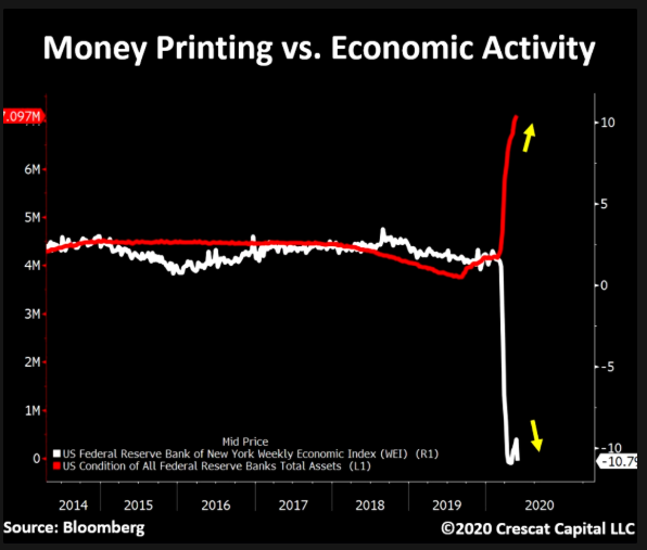 Economic activity fell off a cliff. Money printing went nuts. Look at his chart where the white line is economic activity and the red line is assets of all the Federal Reserve Banks ????: