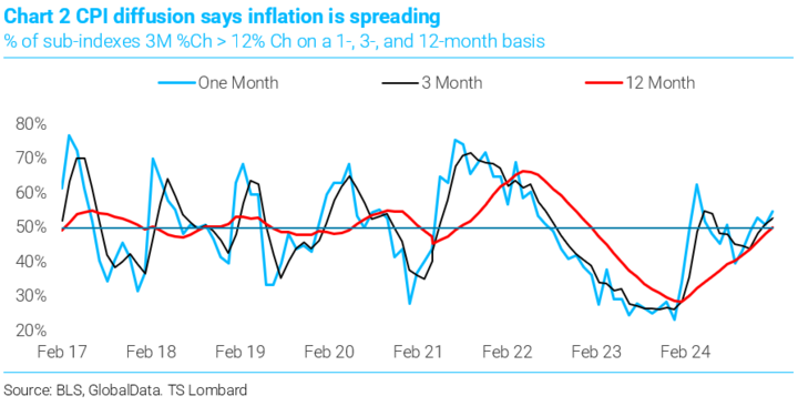 But the diffusion index shows more than 50% of the CPI sub-indexes have a 3-month percent change > 12M percentage change. Inflation is becoming more widespread within the economy, further challenging the outlook for rate cuts.