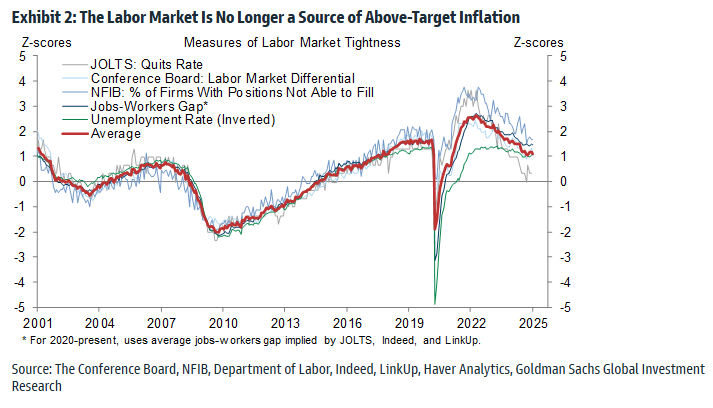 Job openings, quits, and assessments of labor market tightness by workers and firms are hovering at or just below pre-pandemic levels. Wage inflation has returned to the 3.5-4% range that we see as consistent with price inflation of ~2%, meaning the labor market is no longer a source of above-target inflation.