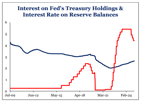 The Fed needs to end QT now, before the debt ceiling is raised given the current nuance of bank reserves being overstated due to debt ceiling dynamics. Keep in mind the Fed is paying 4.4% on short-term liabilities and earning 2.6% on its long-term assets. The Fed has run a cumulative $223bn deficit as it pays out more than it earns on its B/S holdings (red line shows short term funding costs, blue line shows rate of return on Fed’s bond assets).