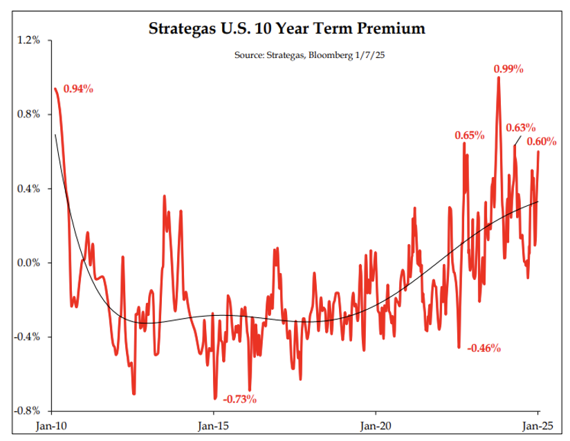 The term premium on 10 year Treasuries is now about 60 bps. We hit as high as 100 bps in October 2023, so it’s not impossible to push higher. Term premia rise for fundamental reasons (higher inflation volatility, higher supply), but sometimes they also rise because of market positioning (i.e., shorts get offsides).