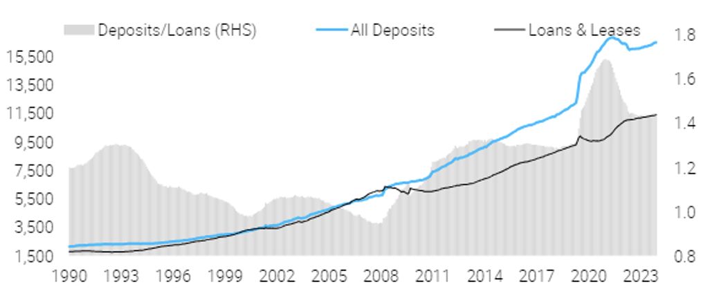 The hangover of Money Supply growth (M2) from 2020-21 remains on bank balance sheets in the form of heightened deposits. Banks have been earning attractive returns from depositing the funds at the Fed rather than lending them out and receiving the overnight rate. It is not a given that these deposits stay at the Fed when a positive yield curve at the short end meets up with expanding private credit demands, as seen from late 2021 to late 2022.