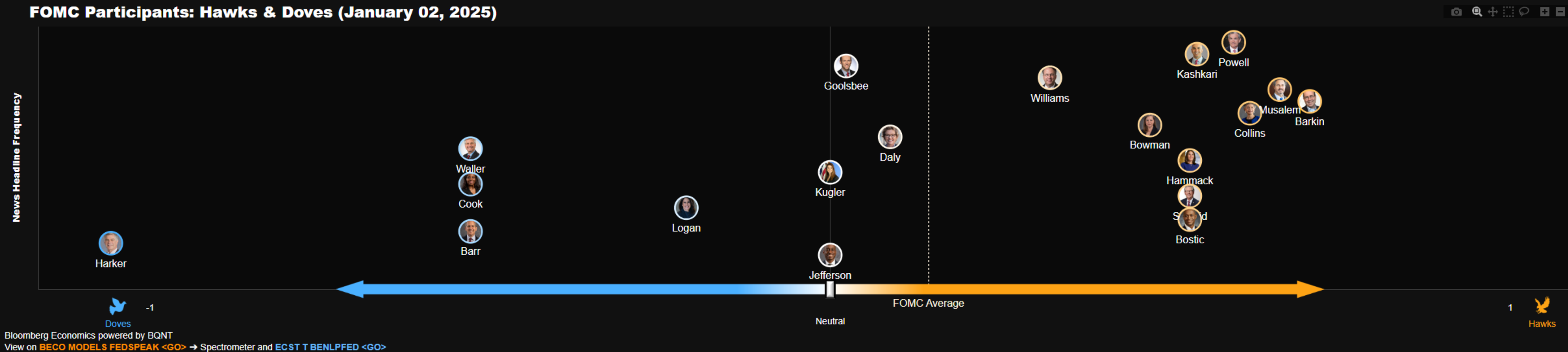 The new voters on paper are arguably slightly more hawkish than the members they are replacing, shown below in Bloomberg AI’s scale of hawkishness/dovishness. The graphic is based on analyzing the words each FOMC member uses, not necessarily the perception of their policy beliefs.