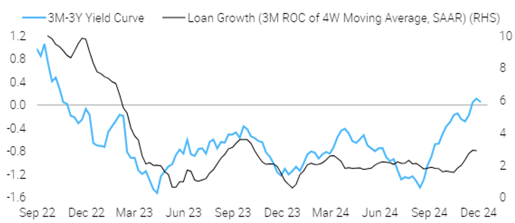 With that said, we are already seeing an uptick in loan growth with the 3M-3Y yield curve turning positive. The more positive it is, the greater the profit incentive for banks to lend.