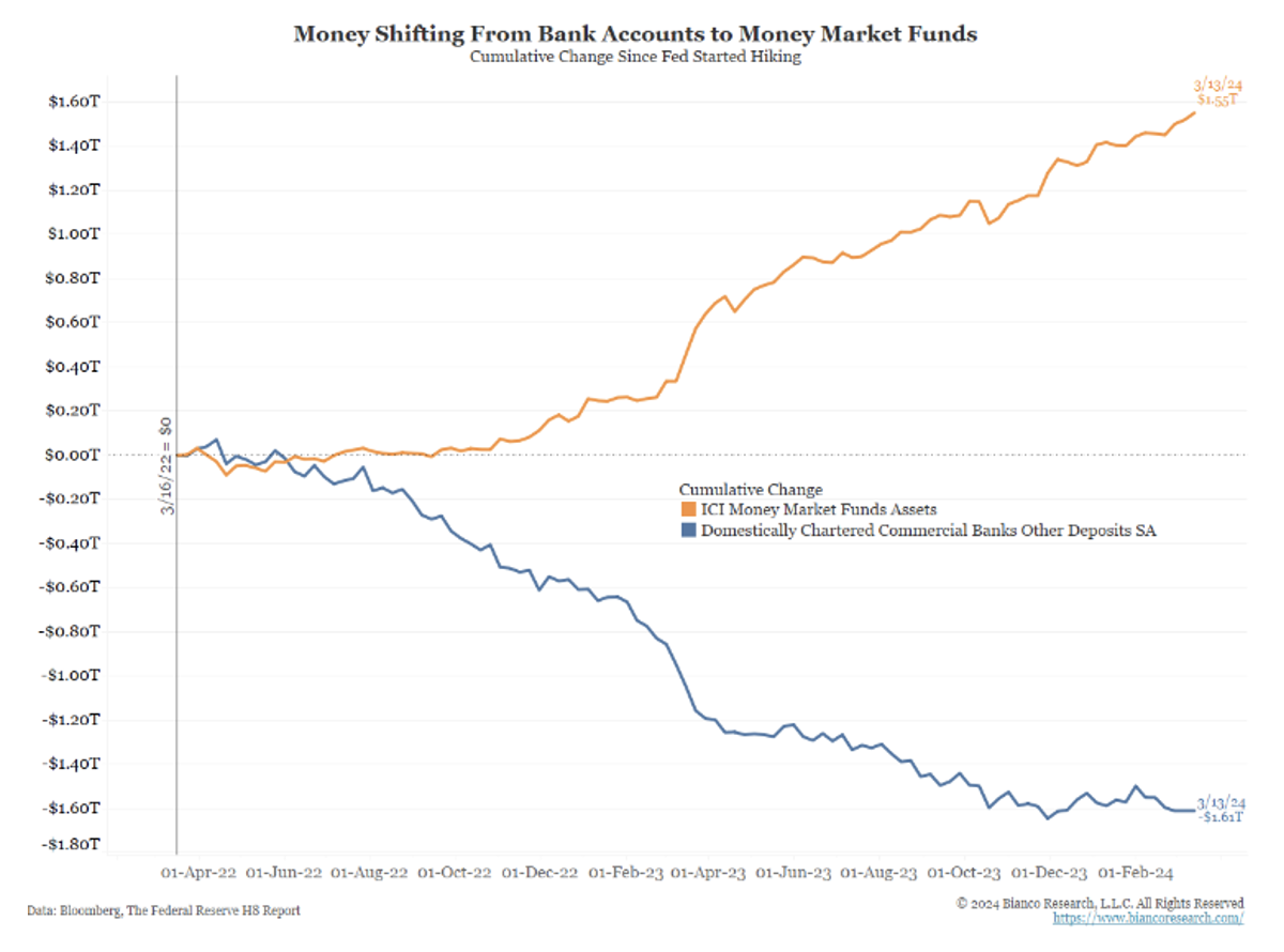 However, in the aftermath of the Great Financial Crisis, central banks focused rules and regulations on systemic banks, pushing lending into other areas of the financial system. This was further exacerbated by the Federal Reserve’s rate hike campaign in 2022, with higher rates drawing cash out of 0% checking/savings accounts into higher-yielding money market funds.