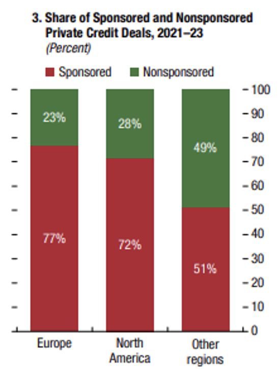 I’ll include one final bonus risk – the private credit system is intertwined with a mix of self-dealing. According to a recent IMF (International Monetary Fund) study¹, 81% of private credit assets are managed by firms that also manage private equity funds. As shown below, 72% of US deals are to borrowers with private equity sponsors. While not to suggest any nefarious activity, it isn’t farfetched to think that credit deals are being used to prop up invested capital within private equity.