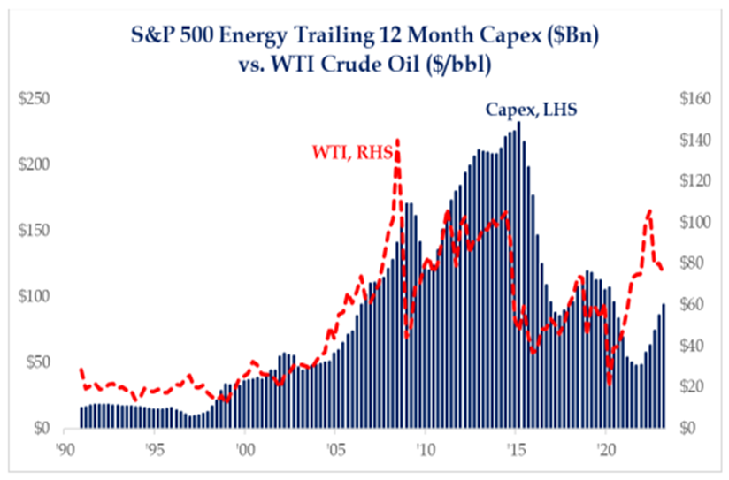 Longer-term, we believe structural undersupply borne by chronic underinvestment will support oil prices. After all, as quickly as OPEC can support markets by cutting supply, they can also bring it back into strong demand. What can’t be so easily manipulated is the type of long-cycle investment that has eluded global commodity markets over the last several years. This is seen perhaps most clearly here in the US, where investment has taken a backseat to shareholder-friendly cash return policies. Even with rampant oil service cost inflation, nominal capital expenditures still haven’t retaken 2018/2019 levels, much less the early part of the decade. This has global implications, as the US is now the largest producer of crude oil and liquids products.