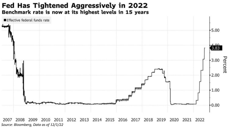 Every rate increase came with further guidance from the Fed that additional increases were likely warranted, leading the markets to continually reprice expectations for where interest rates would eventually settle. As we said earlier, the 10-year Note doesn’t act in a vacuum – it has some correlation to the Fed Funds rate and can’t stay still in an environment such as that where the overnight rate is rising at such an aggressive clip. It peaked in October at 4.24% and currently resides at 3.59%. The high-velocity spike in interest rates this year has been the reason for both equity and bond performance. Higher rates have hurt longer duration fixed income investments, as reinvestment risk is introduced. For equities, higher rates mean a higher discount rate, compressing valuations. In our opinion, rates have been driving the market’s performance all year, and may not likely change in the interim.