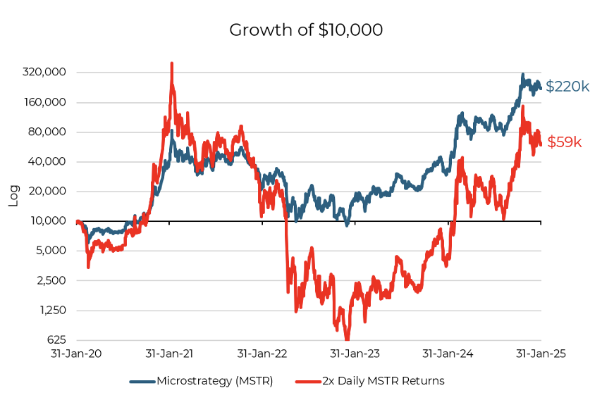 I would note inversing (i.e. shorting) Microstrategy at 2x leverage (yes, there is an ETF for that as well) would have lost an investor -98% of their investment annualized. But focusing on the 2x leveraged long model results; Despite MSTR’s strong arithmetic returns, 2x leverage cuts the levered return by half and nearly eliminates the inverse leveraged return.