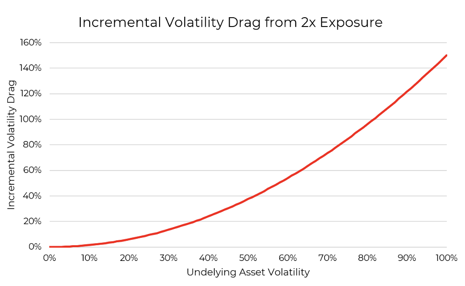Volatility creates a “drag” on returns, which worsens with higher leverage. An example for an asset with 50% volatility: