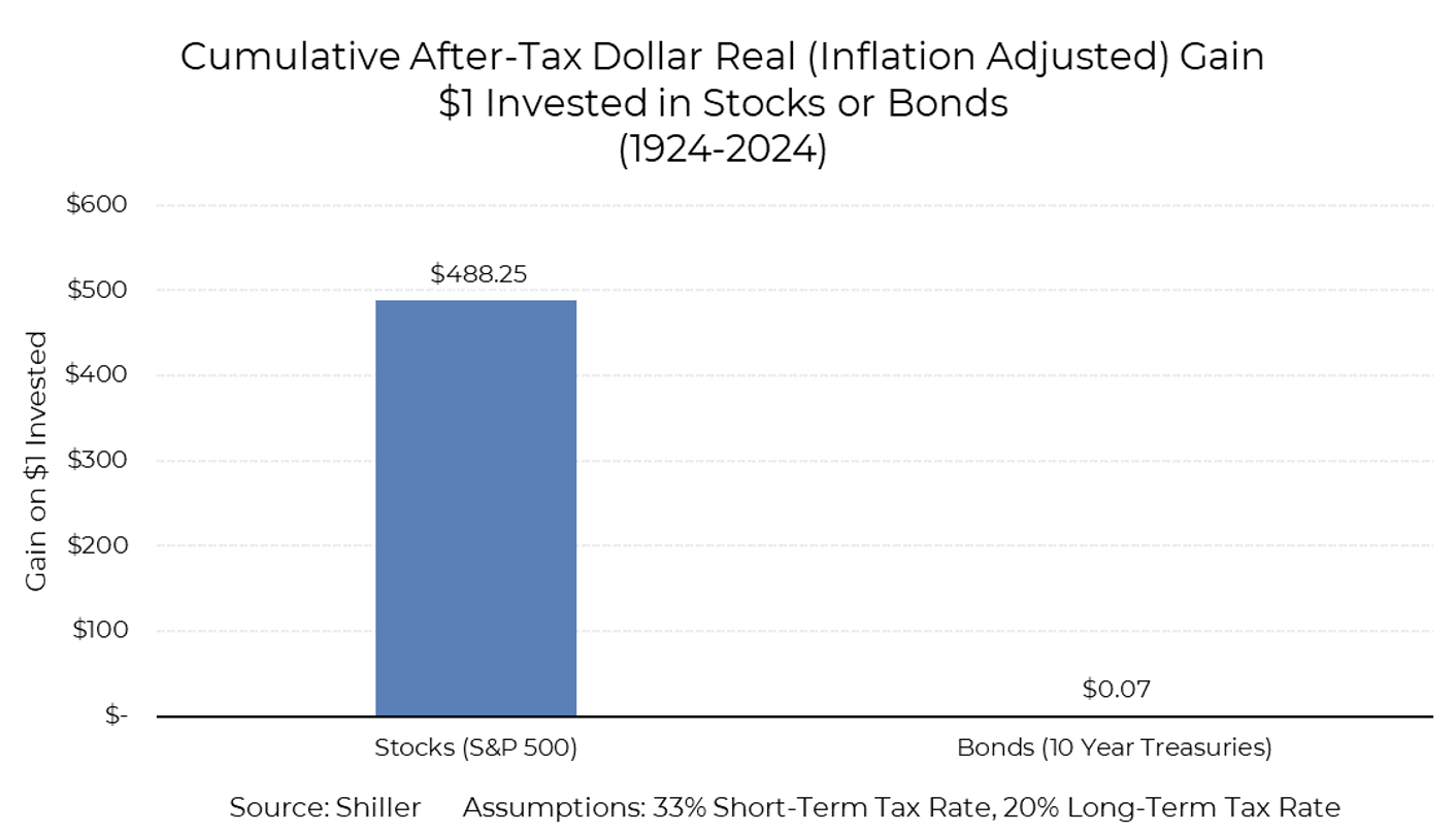 Brian’s post emphasizes the devastating effect taxes and inflation have on the real returns of bonds. The post ends with this chart below. It illustrates the difference between real returns in stocks vs 10-year treasuries. Again, how do you define safe?