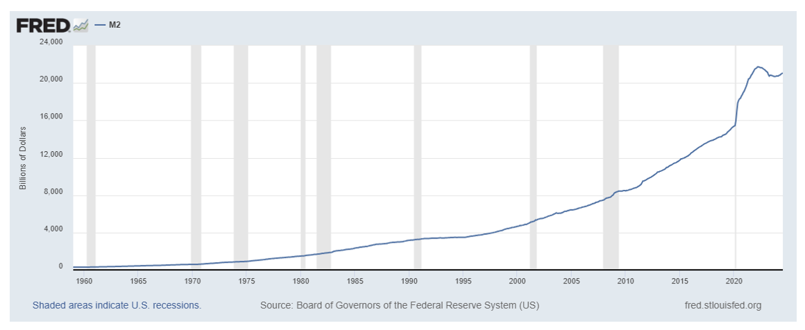 An even better hurdle rate, in our opinion, is the growth in supply of dollars. Since 1960, our money supply has increased by ~7.4% annually. This M2 chart is a decent approximation, looks like that CPI chart only has a much higher (and more realistic) rate of debasement: