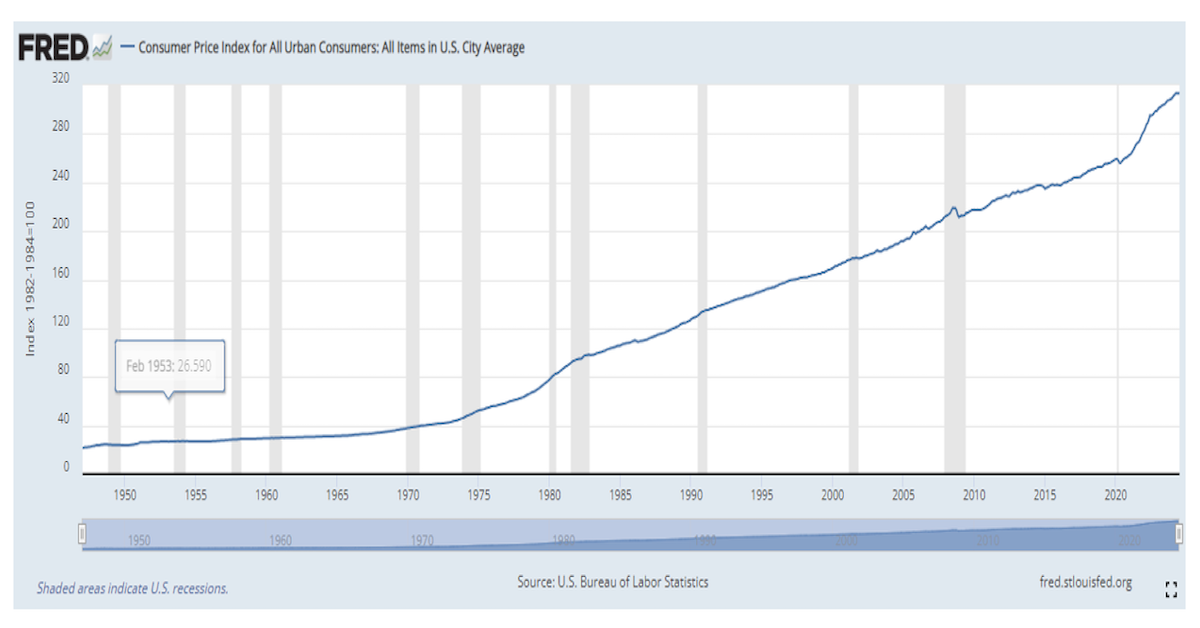 The chart below shows how price levels are always increasing. In other words, the real value of your dollar is constantly dropping.