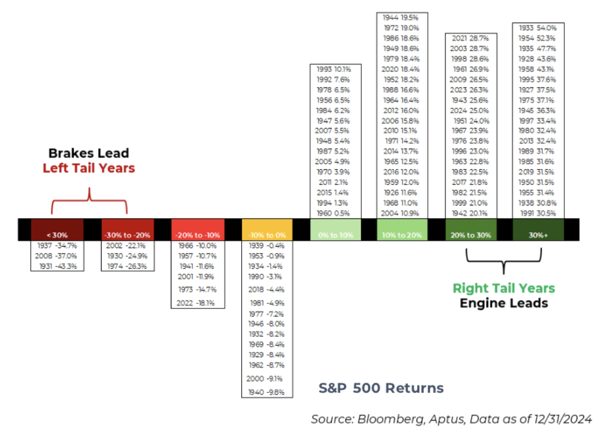 Luckily, as you may know, our strongest conviction is in overweighting equities across portfolios, owning less bonds, and hedging to reduce downside. Drawdowns happen, and selling at the wrong time is one of the greatest threats to long-term returns. We’d emphasize the below charts that show how much more frequent right-tail events are than the left. Staying invested and hedging to reduce drawdown is one of the most powerful tools in our arsenal and one that we lean on.