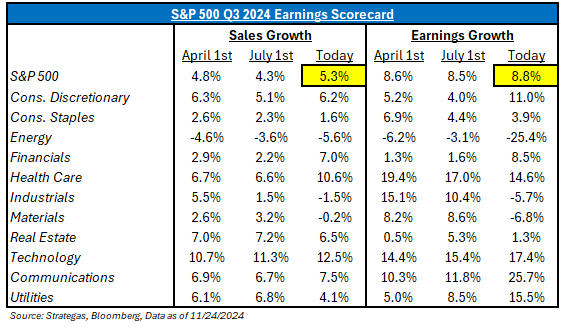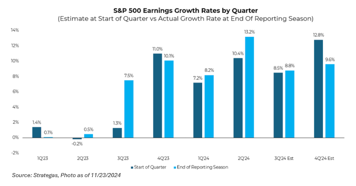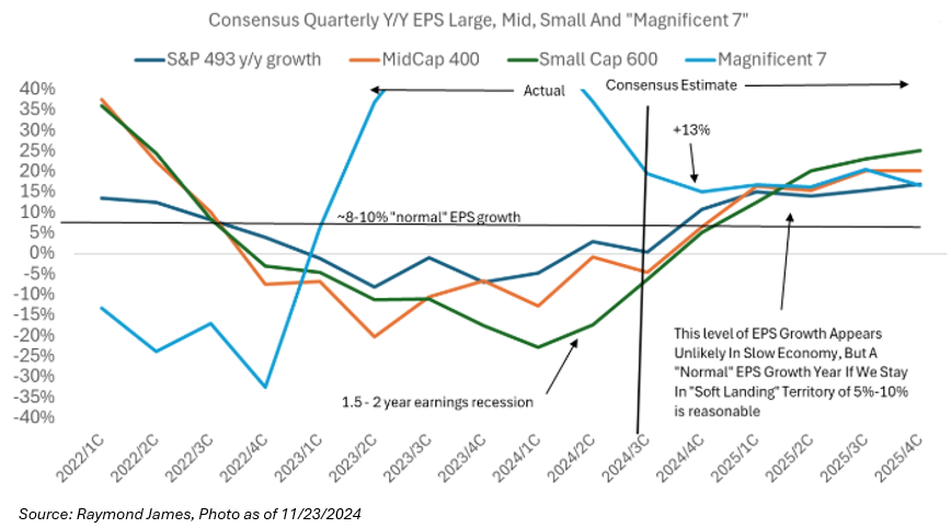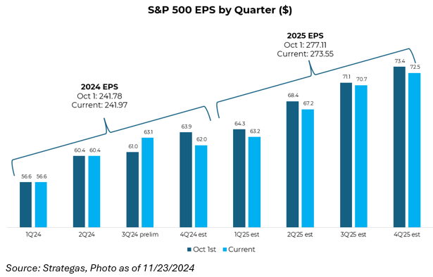 With the market no longer concerned about the election and its shifting focus toward policy uncertainty, the growth rate for next year has come in a couple of percentage points but still remains generally robust. The adjustments are being made to the first half of next year which isn’t all that surprising. As we receive more and more policy clarity, we suspect adjustments will be made. Keep in mind, Trump 2.0 will not see the same EPS benefit as Trump 1.0 simply because a large broad-based tax cut is likely not going to happen for corporations.