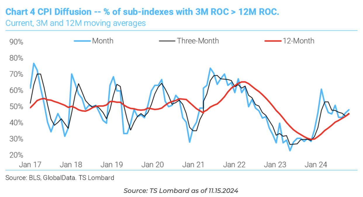 TS Lombard runs a diffusion index that digs into the sub-indexes of inflation and sees which ones have three-month inflation rates above their 12-month rate. They calculate around 50% have 3m inflation rates running above their 12m rate. This doesn’t mean inflation is set to resurge, however it is not a circumstance that implies disinflation.