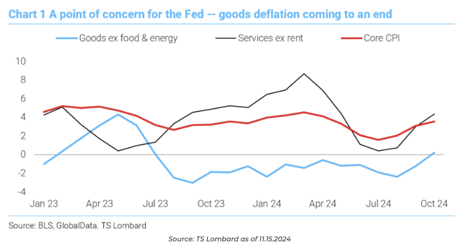 This puts the Fed in a difficult spot where inflation progress is slowing, and economic growth is bottoming and firming. It’s difficult to see the Fed project more easing in the December dots to offset the recent tightening of the bond market, given firming inflation (more on that in a second) and okay growth. Many market participants are suggesting a Fed pause should be in play for December. All of this suggests that the November jobs report in early December will be a key determinant for the December FOMC meeting given their hyper-focus on the employment mandate.