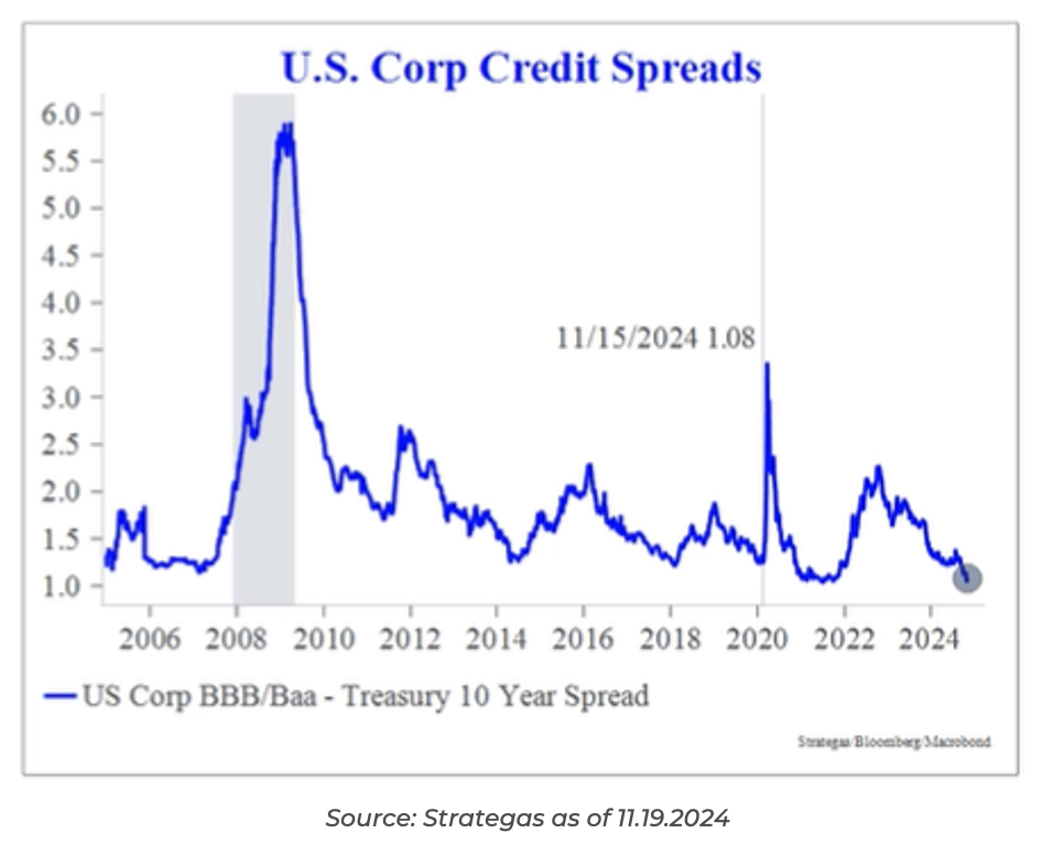 Investment-grade spreads measured at 108 basis points (over Treasuries) as of Friday on the BBB/Baa Index. These spread levels are hovering around their lowest points in the past 26 years (spreads were approximately the same level pre-GFC and in 1998).