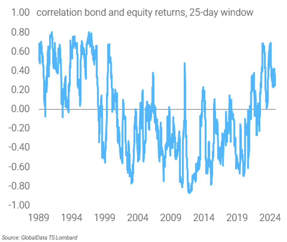 When the bond-equity correlation is negative, bonds have natural hedging properties, and investors are willing to pay an insurance fee to have them in their portfolios (making for a low or even negative term premium). When bonds and equities are positively correlated, those insurance properties disappear, and the term premium widens.